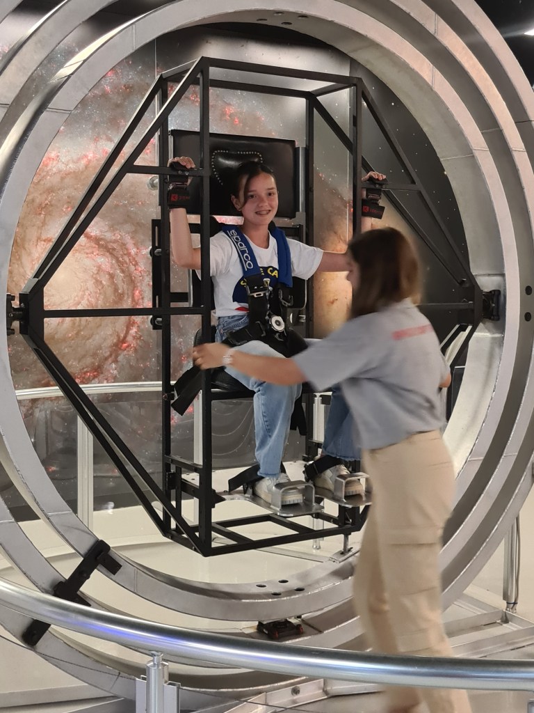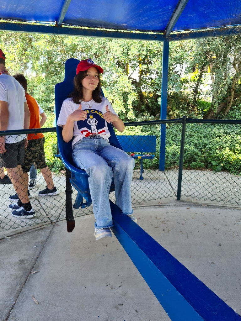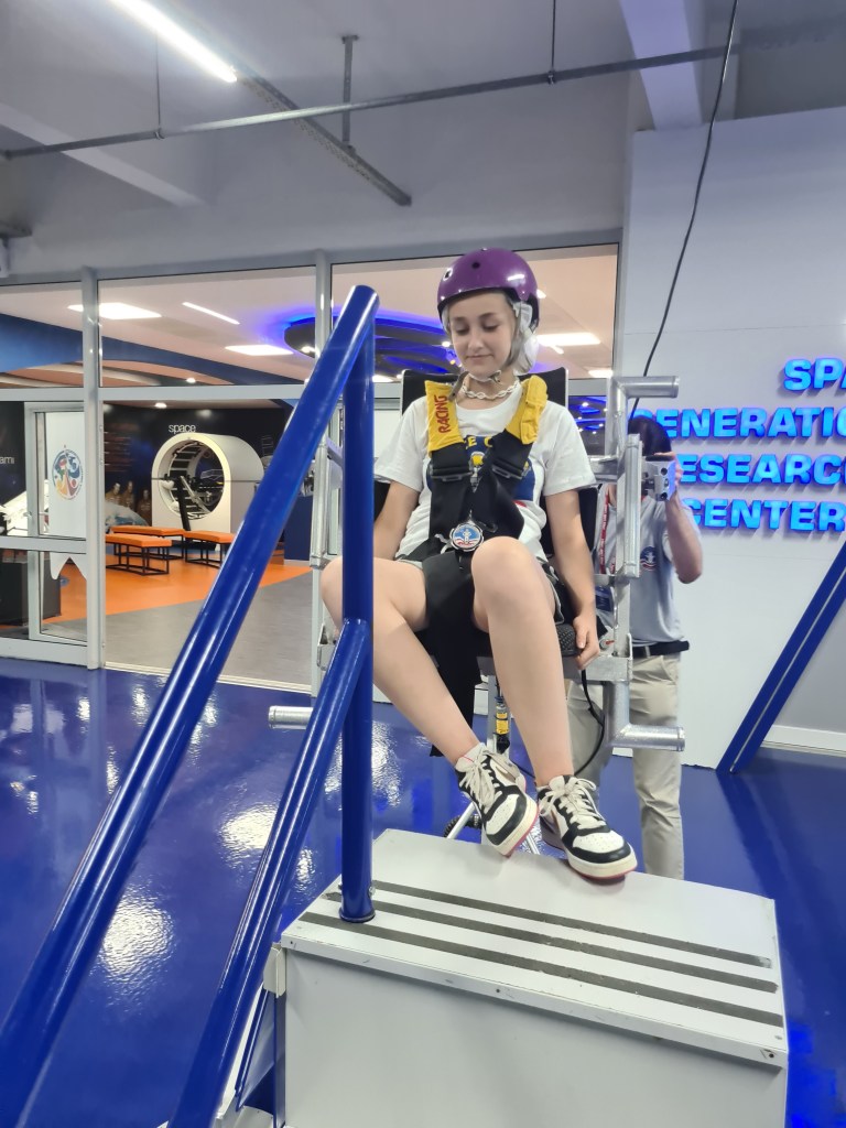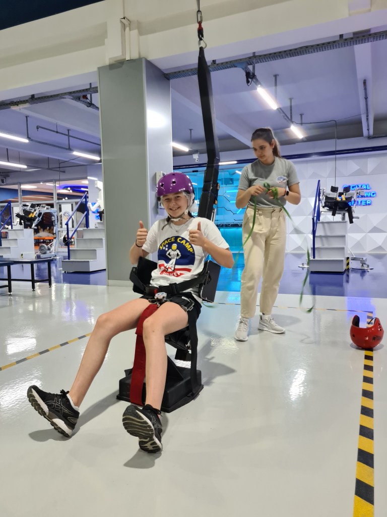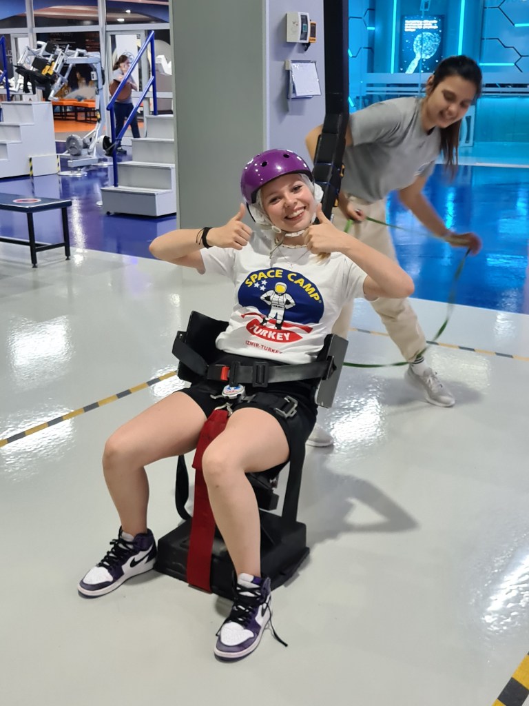 An exciting day for the Fabulous 7! Students woke up at 8, breakfast at 9, and then activities activities, activities! The students have been split into 3 different teams with other international students. Each group does different activities at any given time. Here are some of the highlights I captured today including the 1/6th gravity chair (like walking on the moon), the T-Chair Spinner (have to anticipate where to throw the ball while spinning around), the Mars Experience, the Ham Radio Language Briefing, the 5 degrees of Freedom Simulator (moving around in space), and of course some recreation time. Enjoy, dear parents! We’re having a great time!
