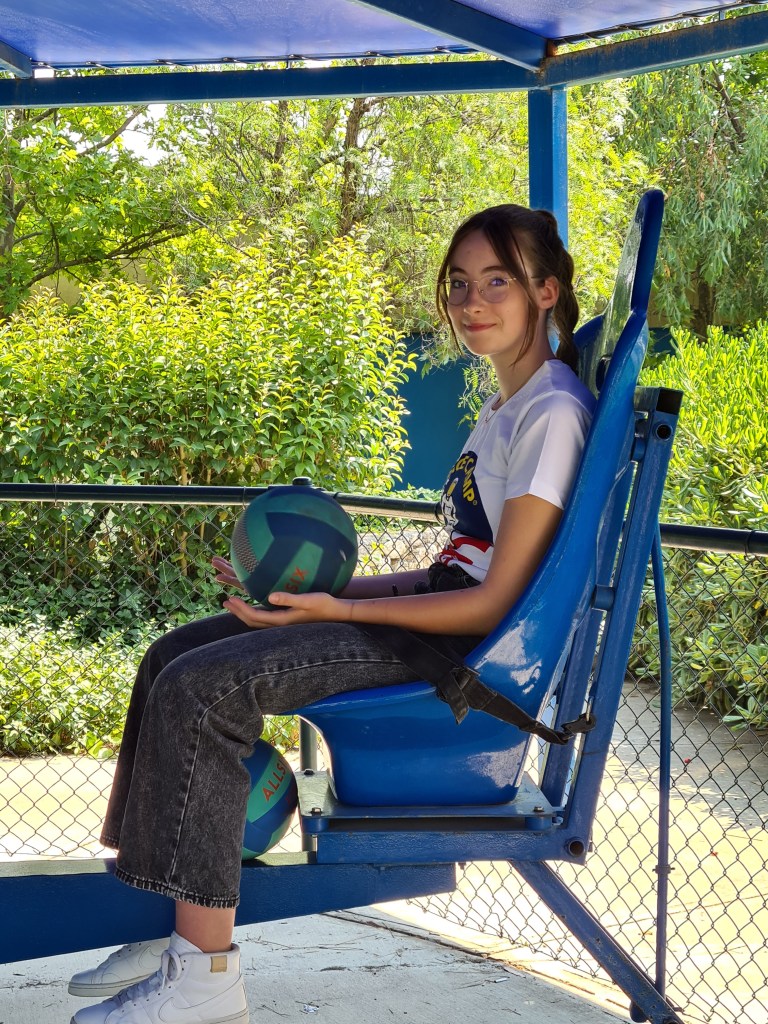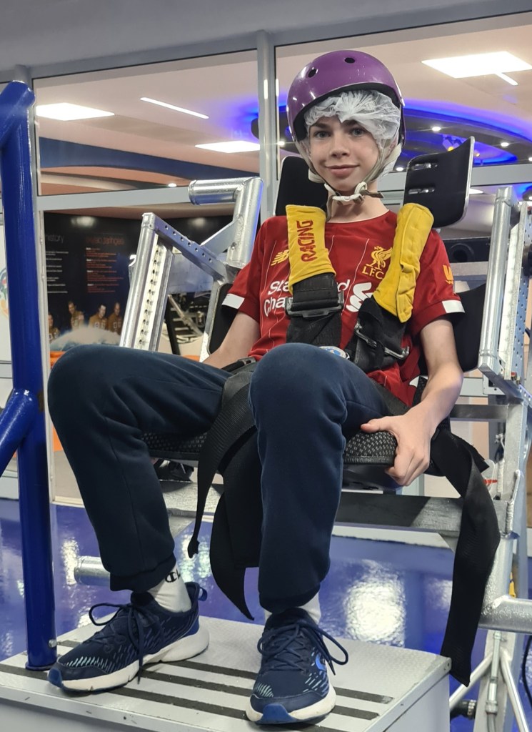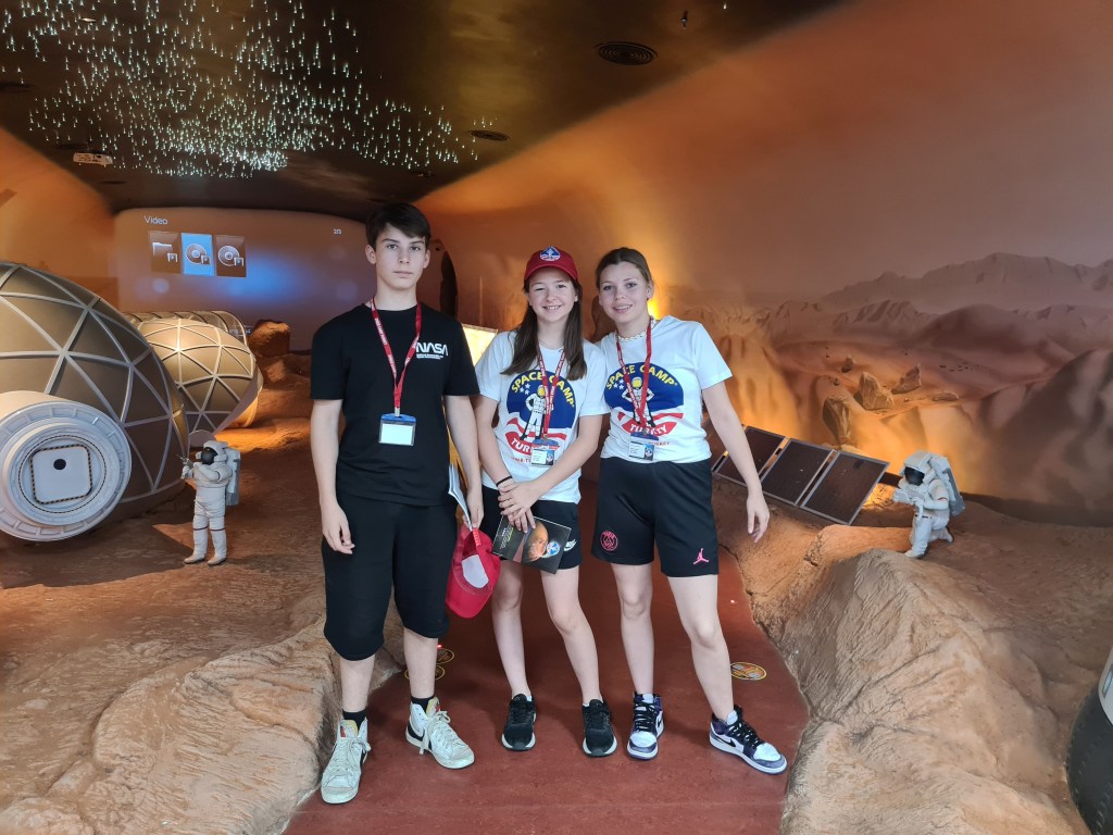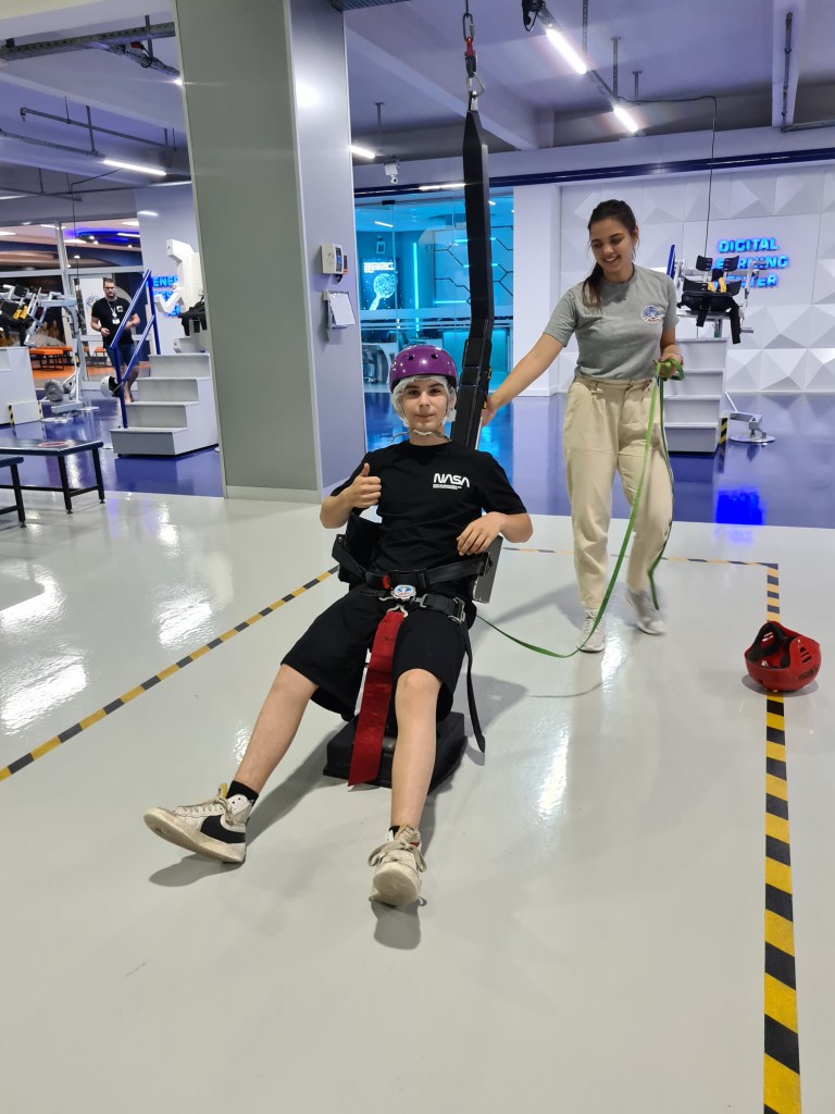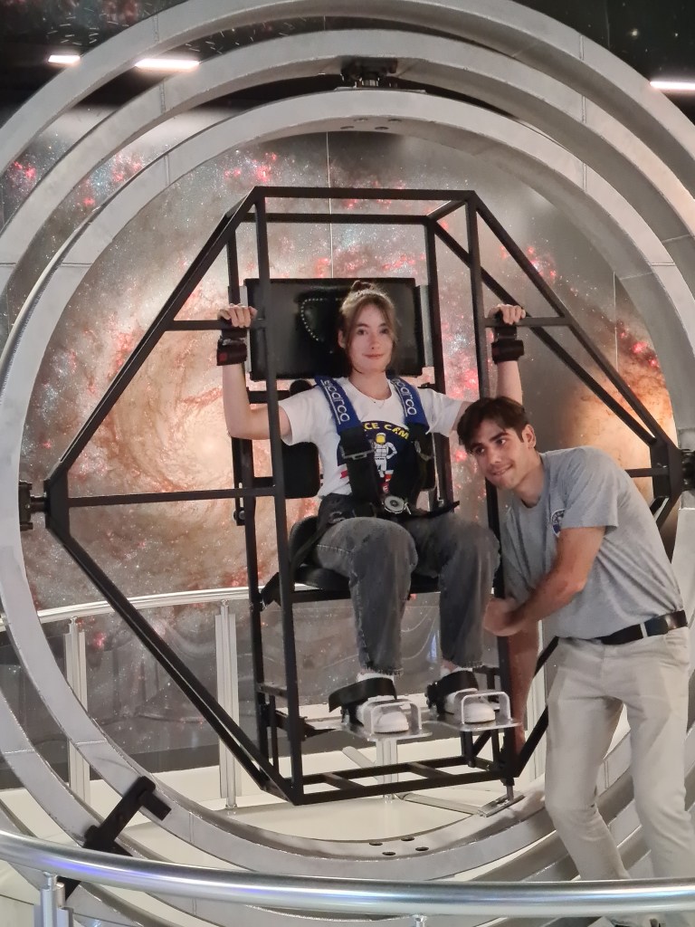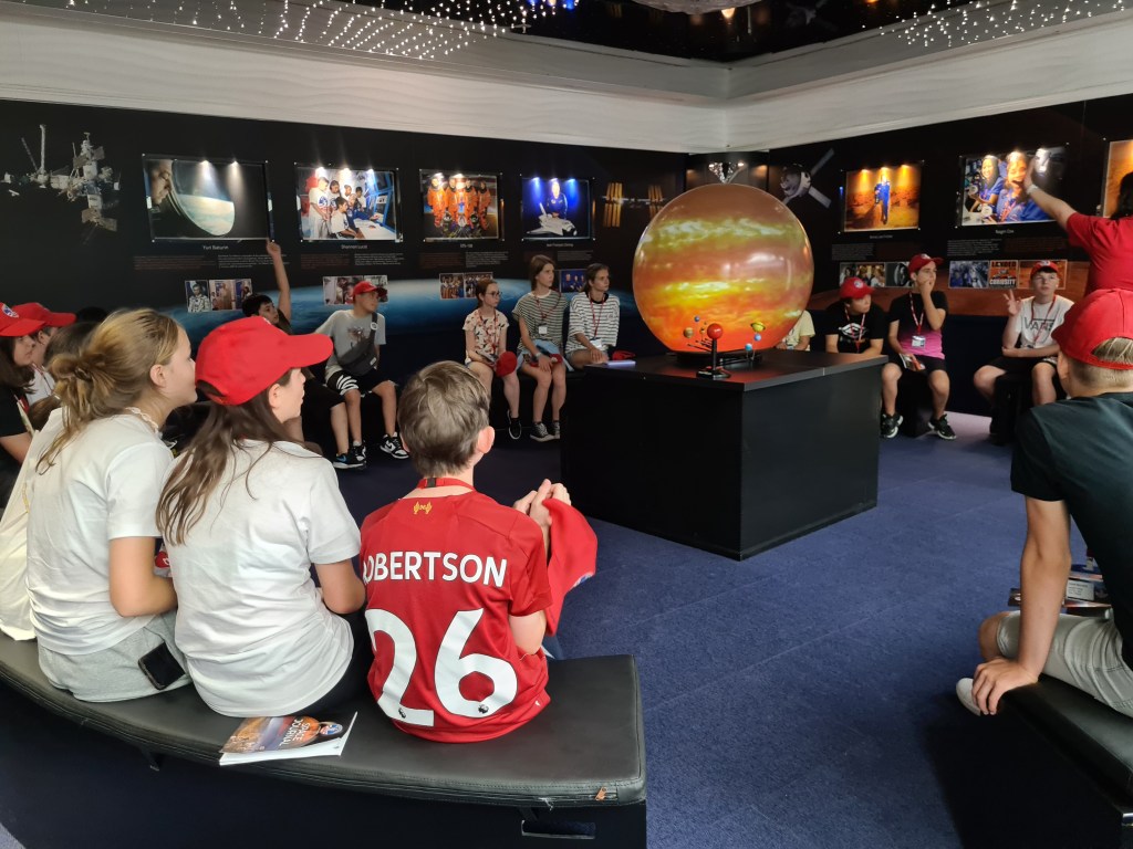 An exciting day for the Fabulous 7! Students woke up at 8, breakfast at 9, and then activities activities, activities! The students have been split into 3 different teams with other international students. Each group does different activities at any given time. Here are some of the highlights I captured today including the 1/6th gravity chair (like walking on the moon), the T-Chair Spinner (have to anticipate where to throw the ball while spinning around), the Mars Experience, the Ham Radio Language Briefing, the 5 degrees of Freedom Simulator (moving around in space), and of course some recreation time. Enjoy, dear parents! We’re having a great time!